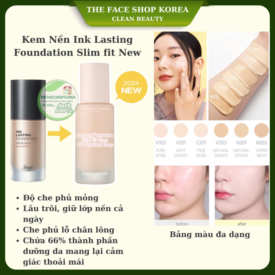 Kem nền che khuyết điểm trang điểm đa năng dưỡng ẩm lâu trôi The Face Shop Ink Lasting Foundation Slim Fit Ex SPF30 PA++